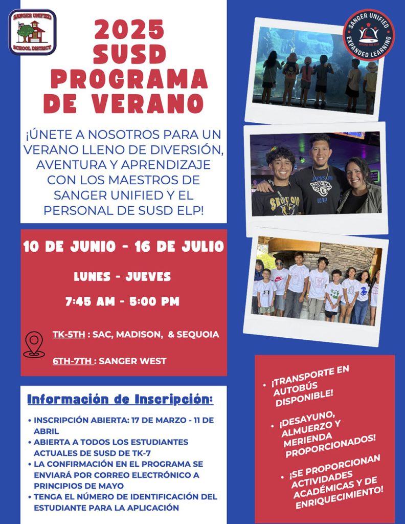 Fall Sanger ELP (After School Program) enrollment is now open! Please click the link and select your child's school to enroll for the 25-26 school year. Have your student's ID number on hand for easier processing. Please note that you should receive an email response once your application is successfully submitted. Sanger ELP Programs are FREE and include a daily snack. Programs run from the conclusion of the school day until 6:00pm. Thank you, we look forward to another great year of after school programs!